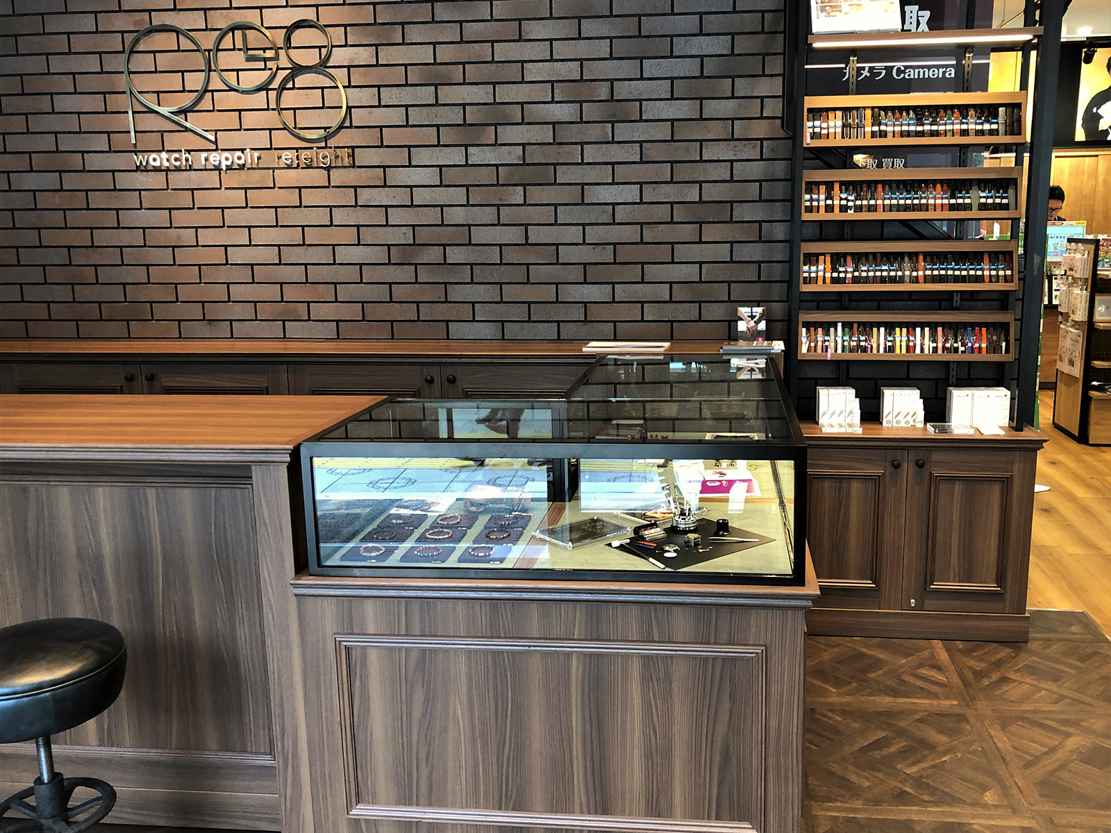 | 内容 | 写真・カメラ専門店「カメラのキタムラ」が新たに開始する、時計修理サービス店舗 Re8(リエイト)の1号店です。 作業スペースを窓側に設置することで外側から店内工房が見えることでアイキャッチとなり、時計修理店と認識できるような作りとなっています。 |