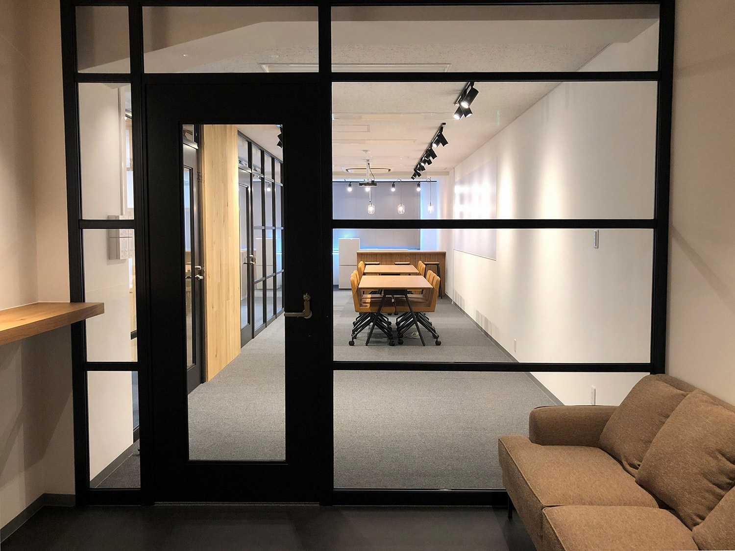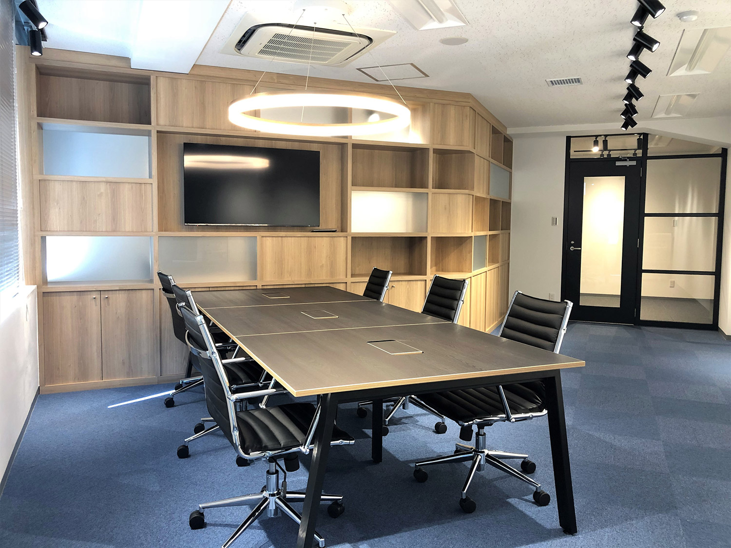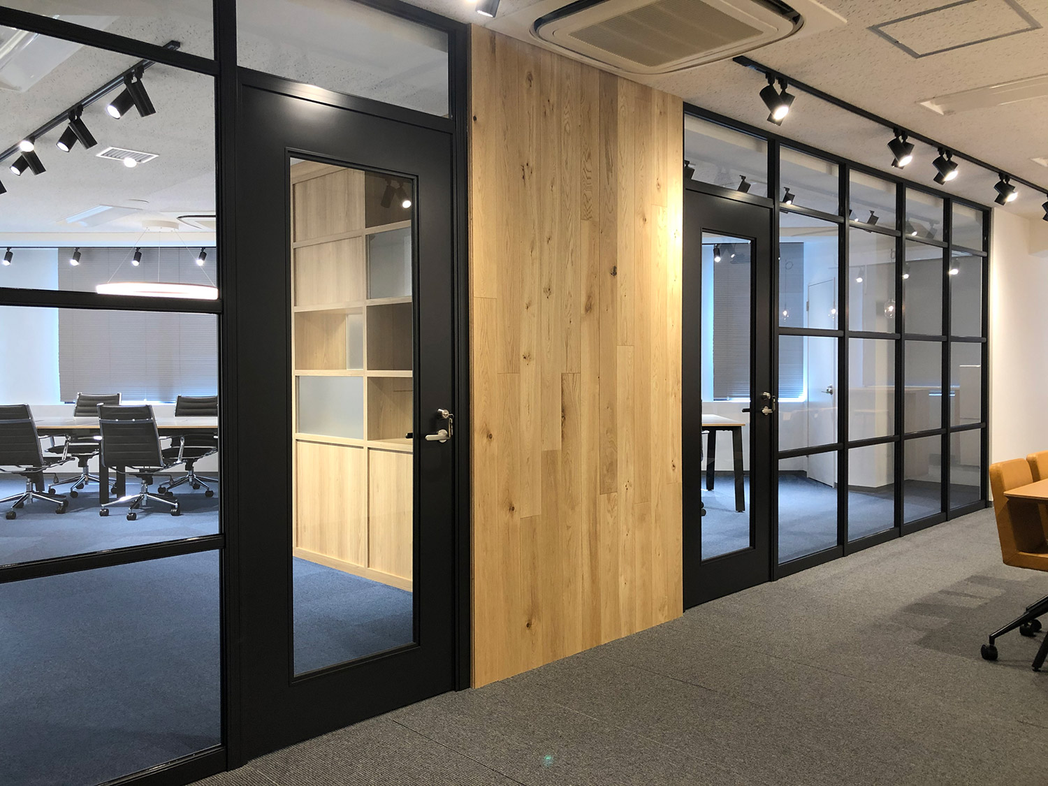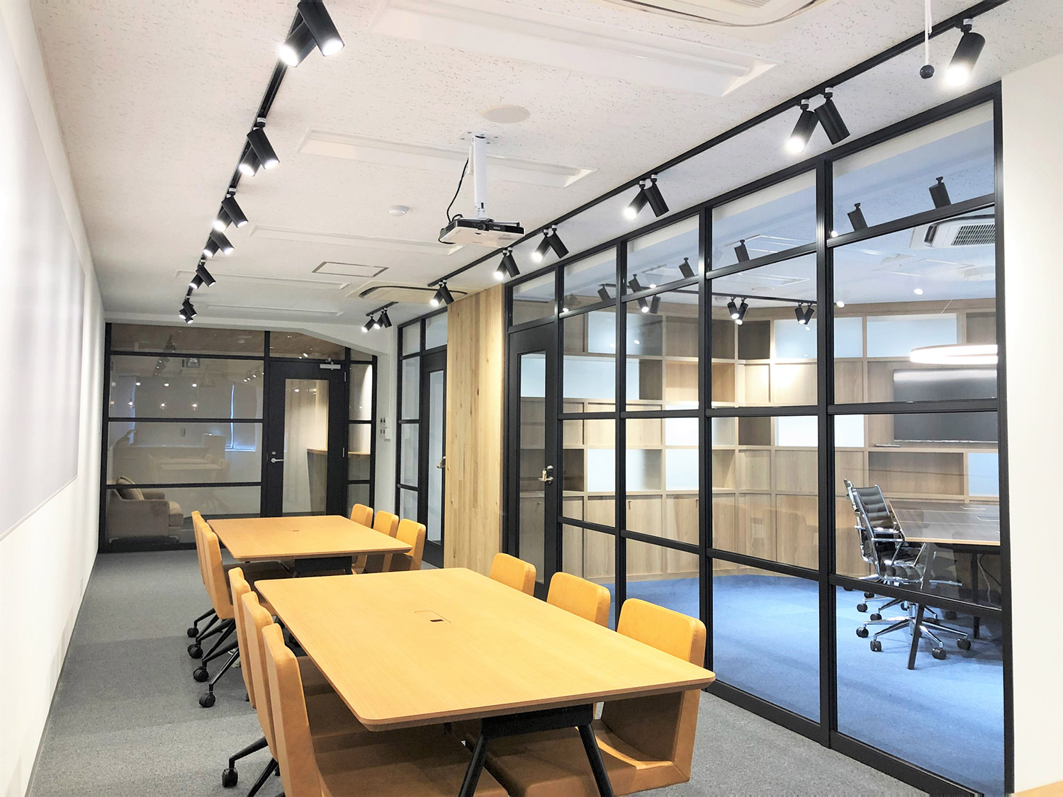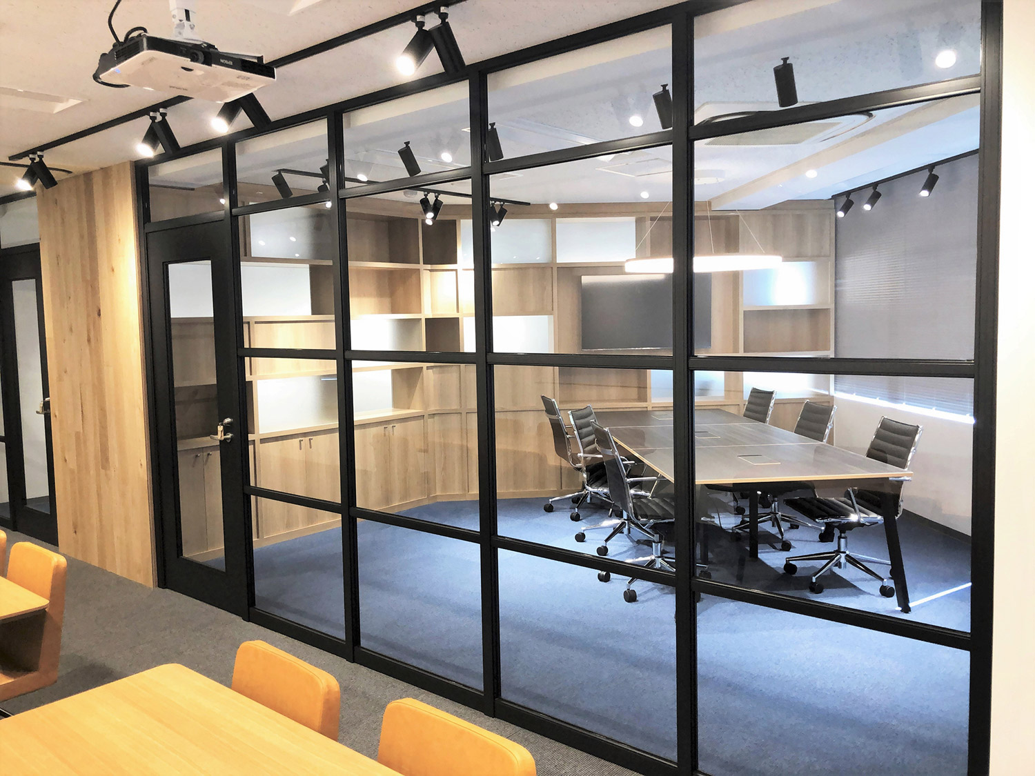 内容ミーティングスペース間を両面使いできるグリッド家具にて仕切ることにより、収納スペースを確保。一部の背板をスリガラスにすることで、開放感のある明るいオフィスとなっております。