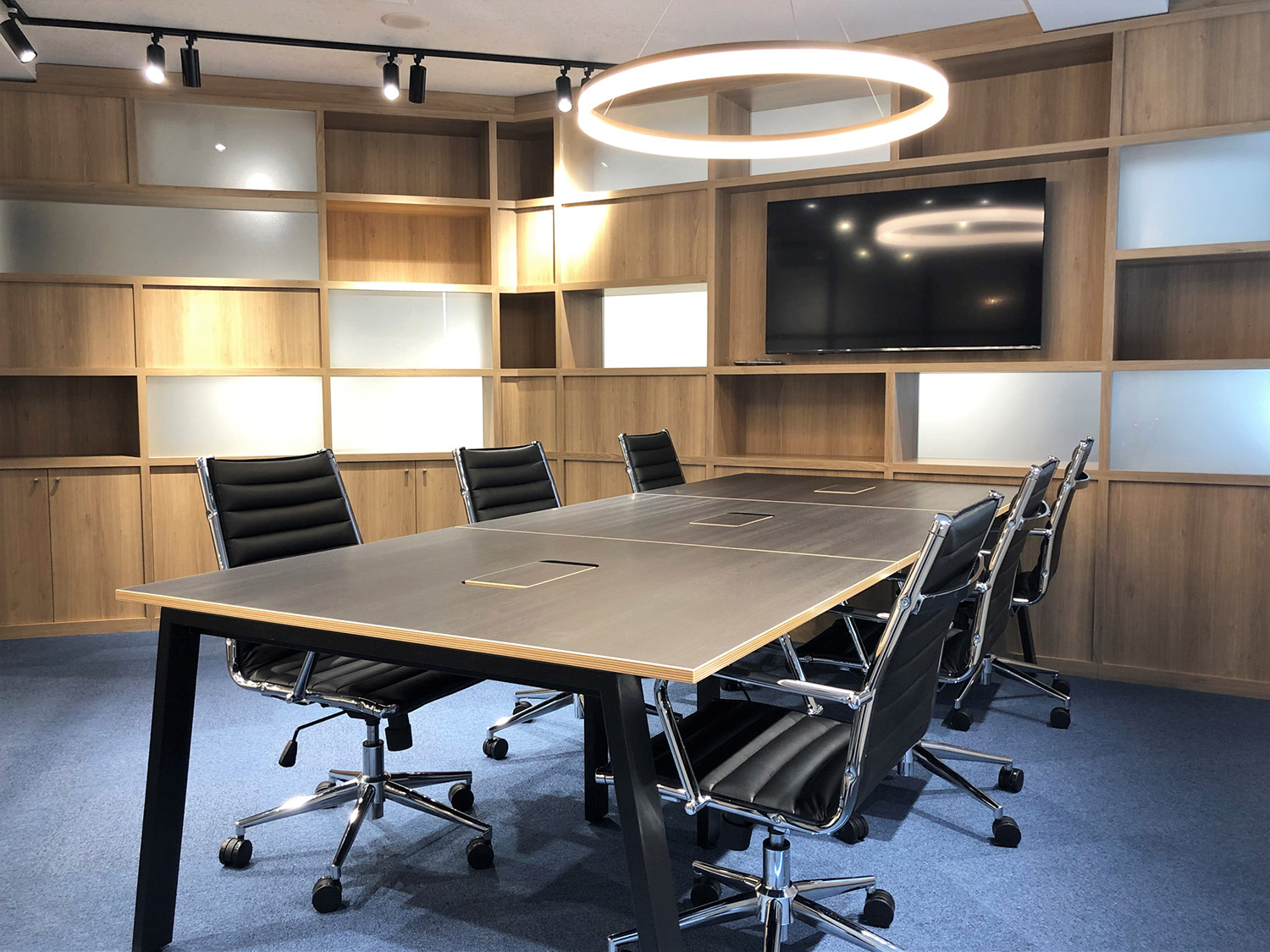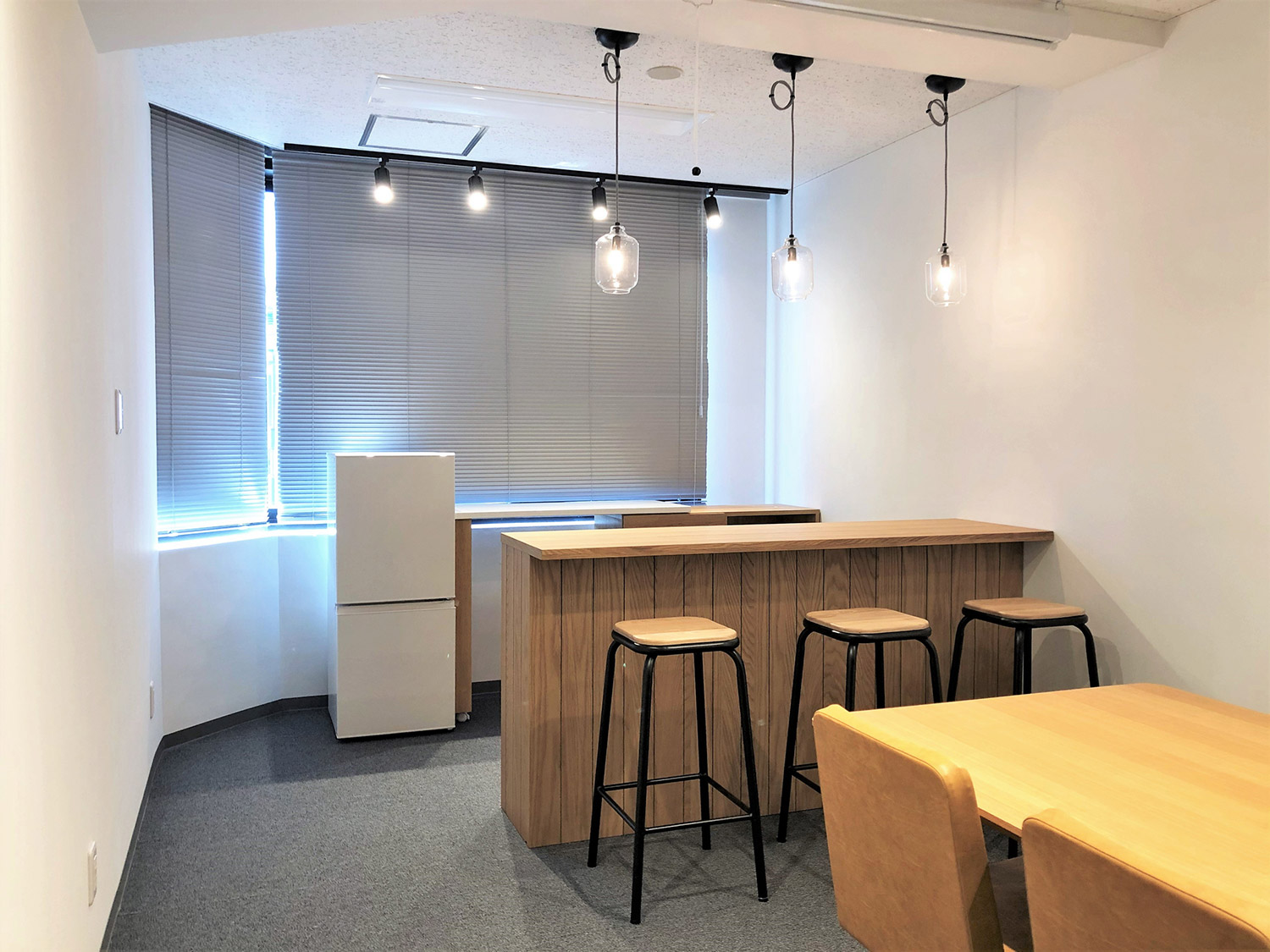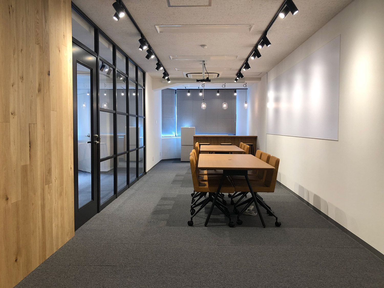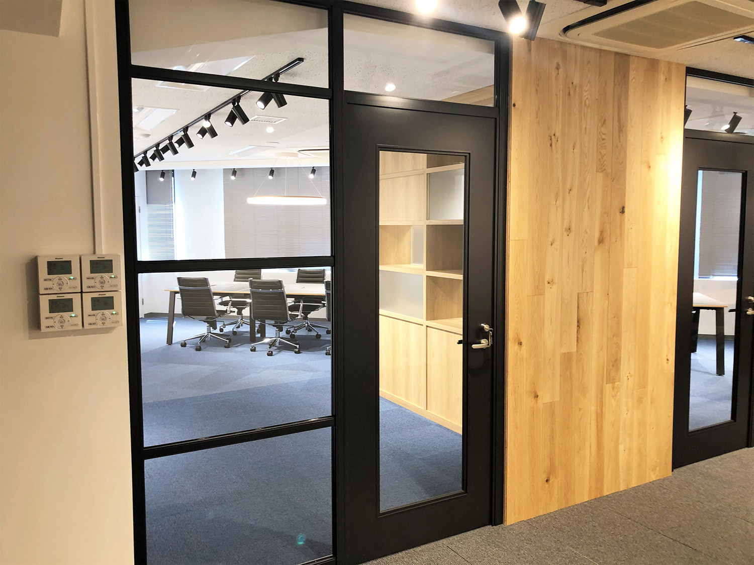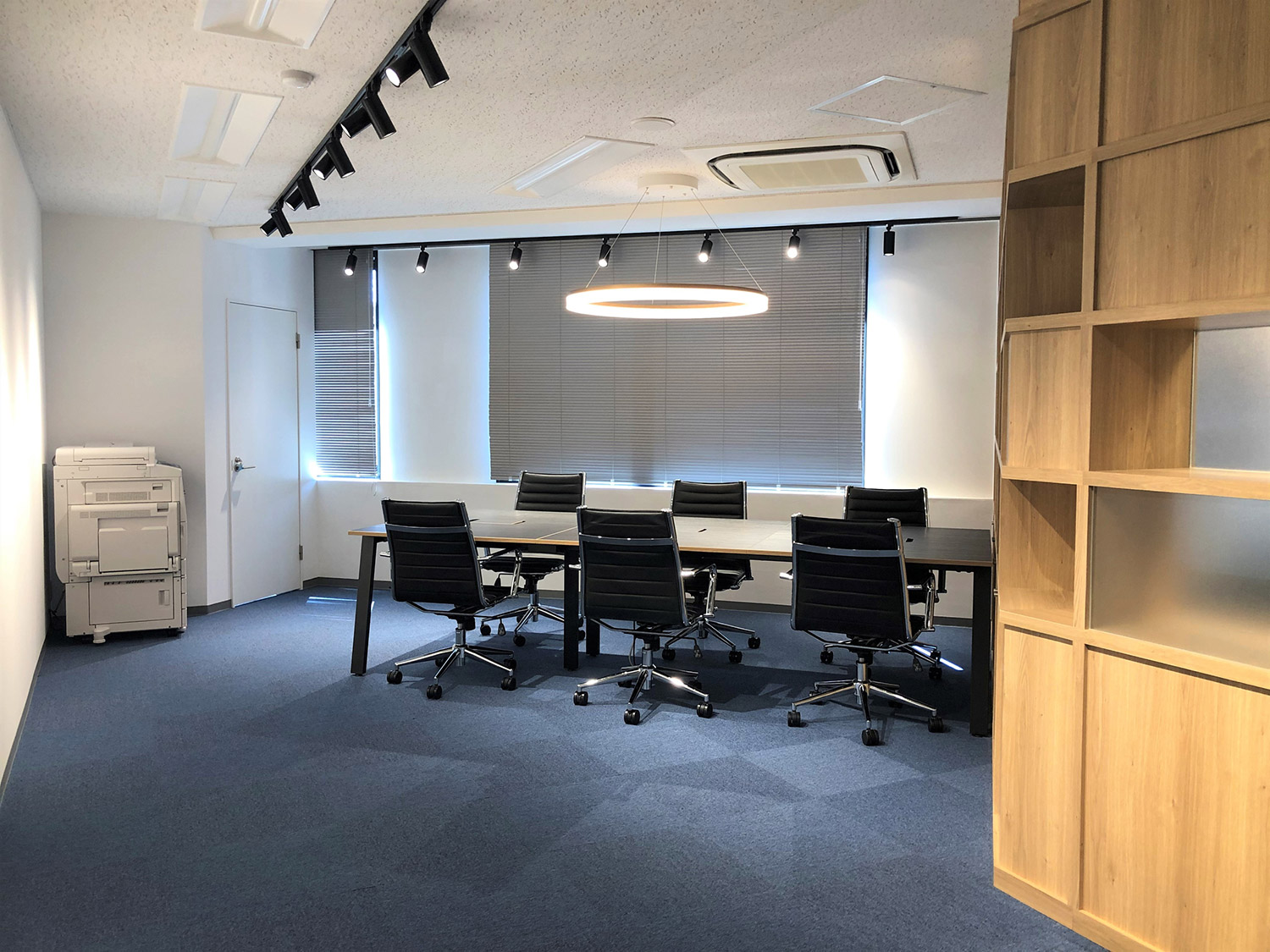 内容ミーティングスペース間を両面使いできるグリッド家具にて仕切ることにより、収納スペースを確保。一部の背板をスリガラスにすることで、開放感のある明るいオフィスとなっております。